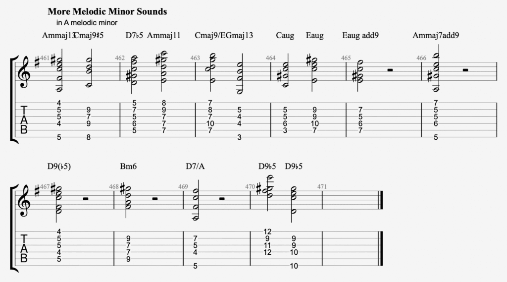3) Finally, we got the maj7b5 created from the 3rd degree of the melodic minor scale. This gives you a maj7#5, which in A melodic minor is Cmaj7b5. You can also put a #5 on this harmony too.
