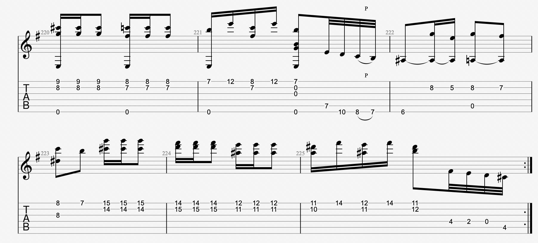 The key to learning this song is to recognize the chords: Ab, Cm, Eb, Db, and Gb/F#. Most of these are in the key of Ab major, which is a good reason why you should learn guitar music theory. I can follow what’s going on in this tab because I know the notes of these chords and the musical key, and thus I’m able to see what’s going on with the harmonic choices and scale runs.