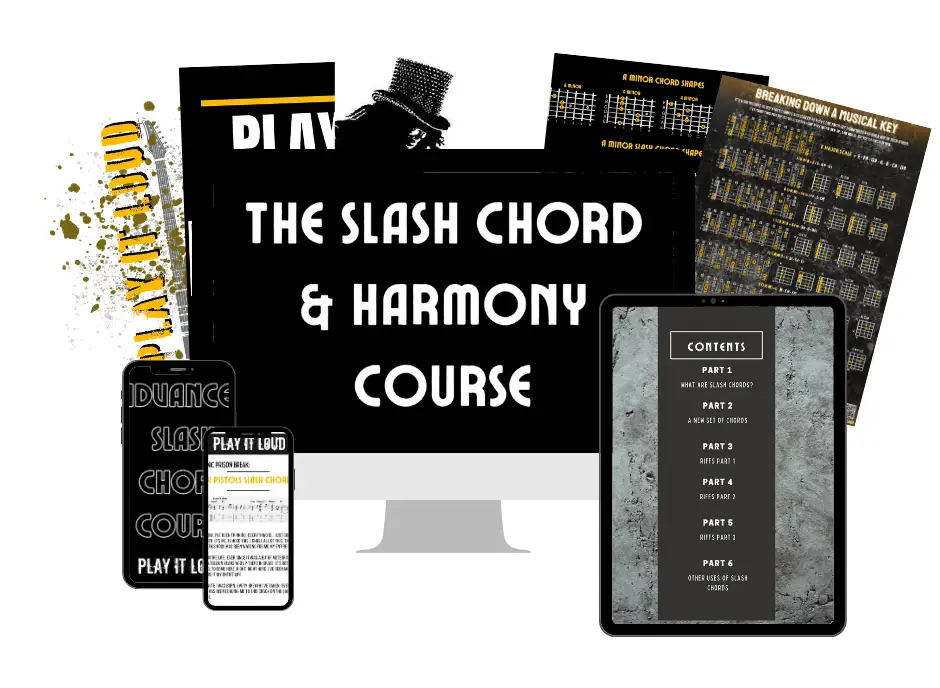 In this course I’m going to reveal a chord type that’s barely understood by most guitarists: slash chords. Let’s put it this way…..powerchords and CAGED are just training wheels for making progressions on the guitar. There is a ton of hidden chords and music concepts I want to reveal to you with slash chords that’ll help you the fretboard with a high degree of sophistication.